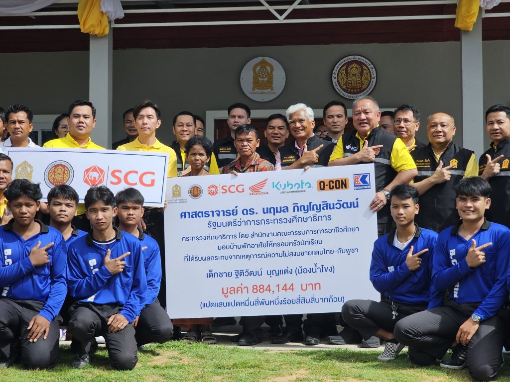โดยมีนายสุทธิ์โรจน์ เจริญธนะศักดิ์ นายอำเภอกาบเชิง จังหวัดสุรินทร์, คุณวิโรจน์ รุจิเจริญชัย บริษัท ปูนซิเมนต์ไทย จำกัด (มหาชน), นาย ธนฐั ชัย สุริย์ฉาย บริษัท คุณเฮงยานยนต์สุรินทร์ (1999) จำกัด, นายยศพล เวณุโกเศศเลขาธิการคณะกรรมการการอาชีวศึกษา ร่วมกันมอบทุนการศึกษาให้กับนักศึกษาที่ได้รับผลกระทบจากเหตุการณ์ความไม่สงบ และมอบถุงยังชีพ และพบปะพูดคุยให้กำลังใจประชาชนในพื้นที่